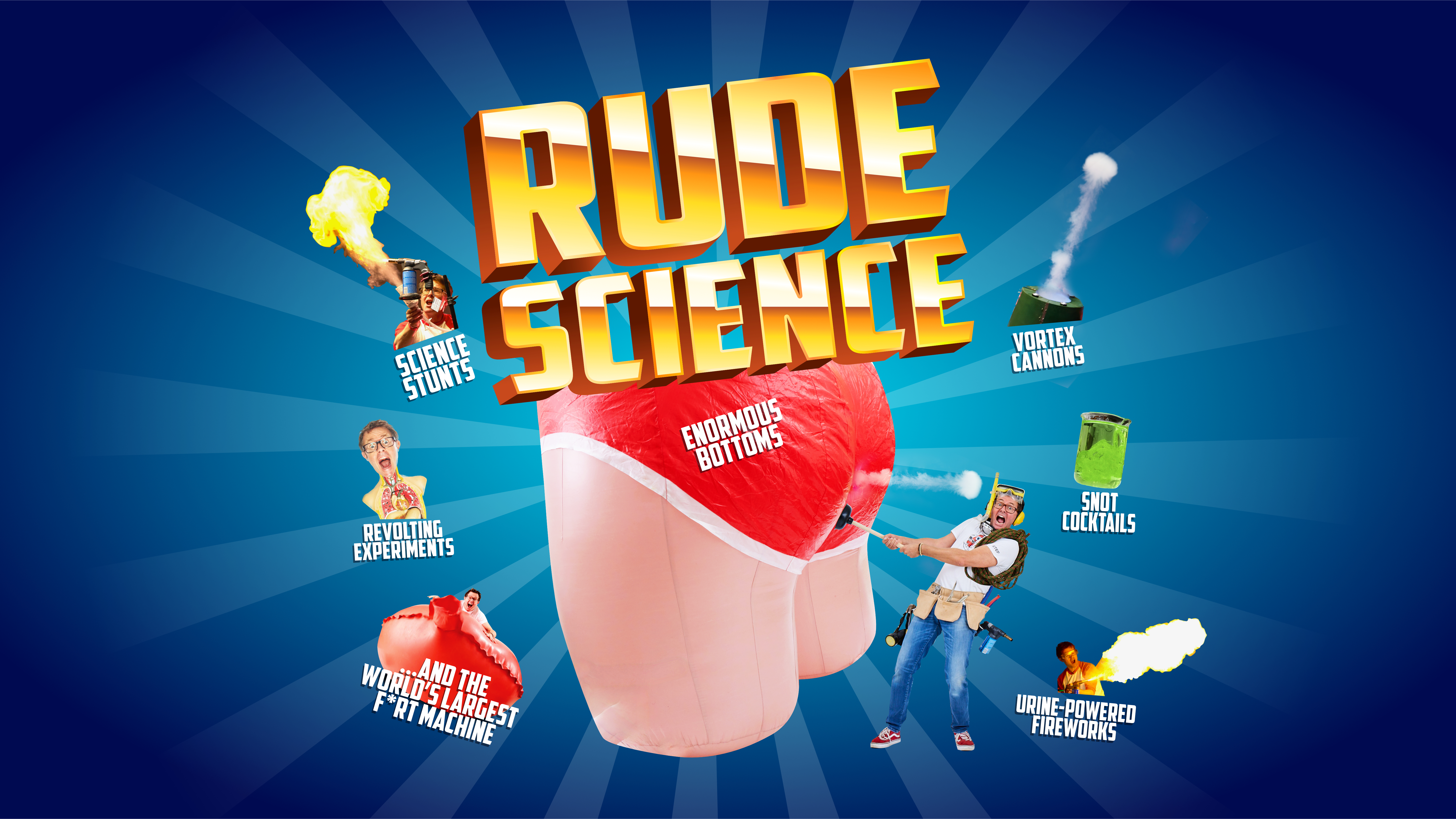Expect enormous bottoms, f*rt machines, snot cocktails, vast whoopee cushions, pee-powered fireworks and ear-wax-oozing mannequins in this celebration of the fascinating bodily science essential to life. The show transforms complex biology, physics and chemistry into educational hilarity using Stef’s signature stunts and encyclopaedic science knowledge.