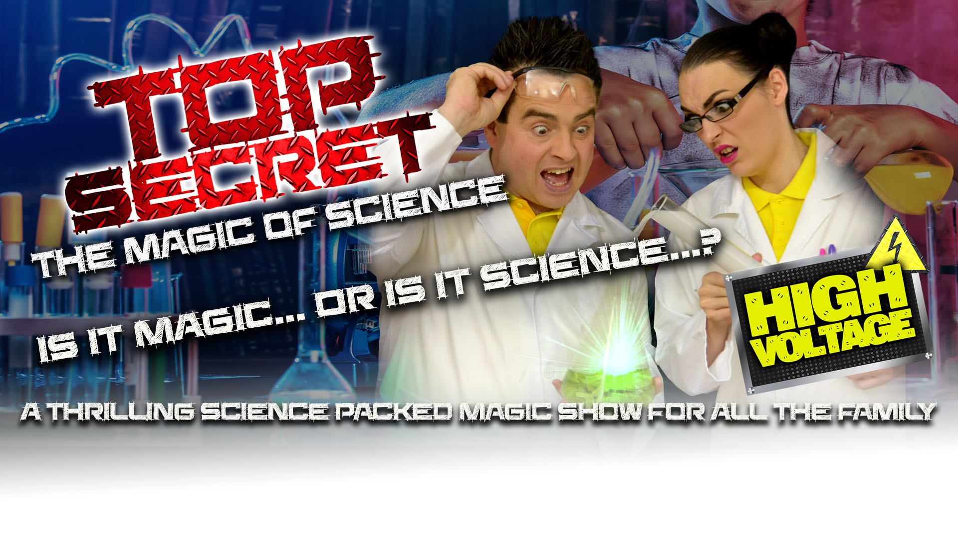 Top Secret is a fast moving colourful magical science show suitable for the whole family filled with mystery, suspense, and lots and lots of mess!
