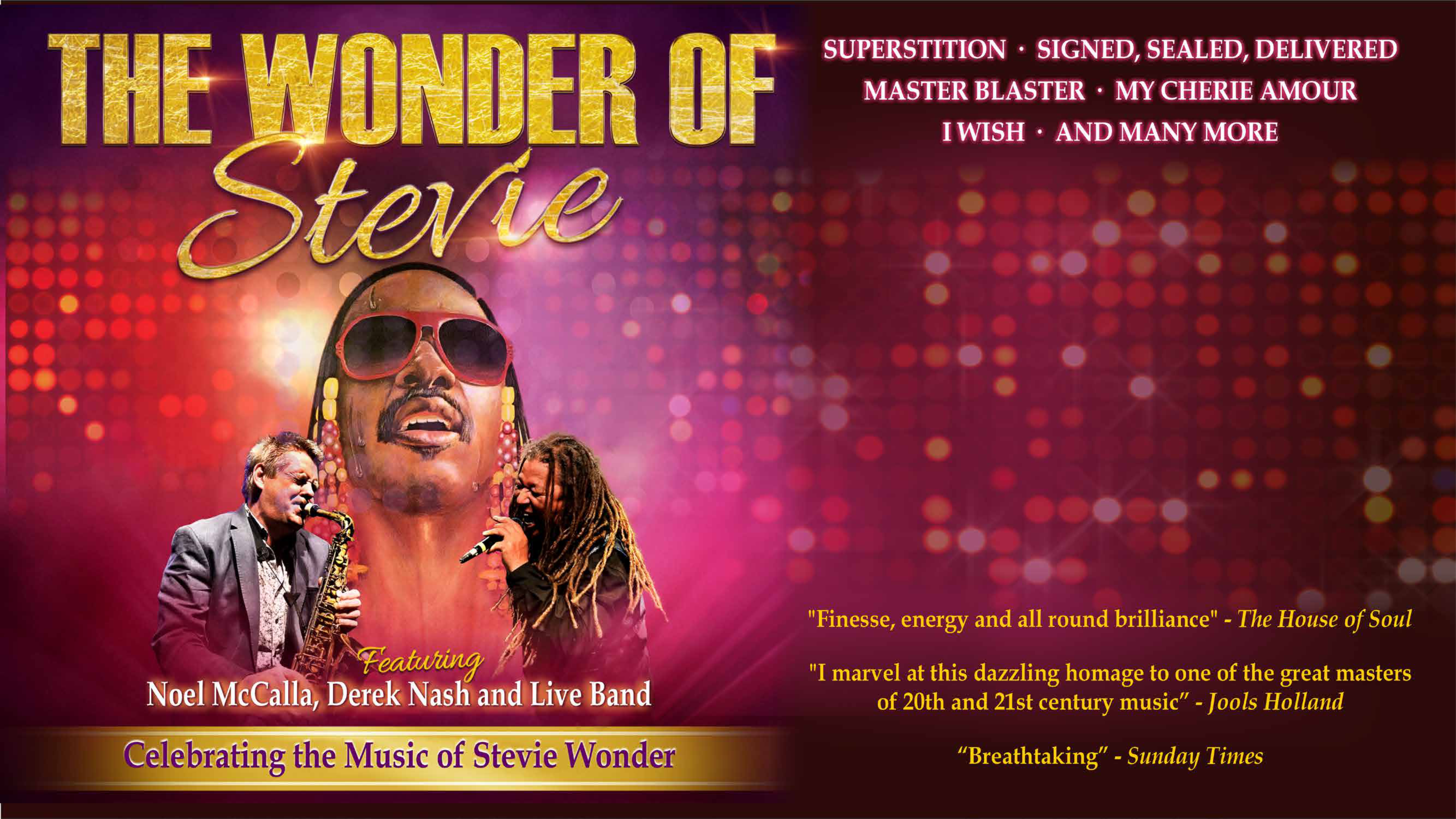 Voted one of Britain’s top soul singers, mesmeric vocalist Noel McCalla, award-winning saxophonist Derek Nash (Jools Holland’s R&B Orchestra) and their world-class band present a diverse catalogue of Stevie Wonder classics from albums including Signed, Sealed & Delivered, Talking Book, Innervisions, Songs in the Key of Life and Hotter than July.